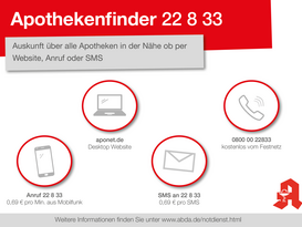 So kann man im Web auf www.aponet.de seine Apotheke finden. Steht keine Internetverbindung zur Verfügung, kann man überall in Deutschland per Handy ohne Vorwahl die 22 8 33 anrufen oder eine SMS (69 Cent pro Minute/SMS) mit der Postleitzahl des aktuellen Aufenthaltsortes schicken und erhält per Ansage bzw. Antwort-SMS die benötigten Infos. Auch über die kostenfreie Festnetznummer 0800 00 22 8 33 ist der Service rund um die Uhr zu erreichen. Rund 12 Millionen Patienten nehmen jährlich den „Apothekenfinder 22 8 33“ in Anspruch. Der Datenpool des Systems wird über Lizenzverträge auch an Dritte weitergegeben, um das Auffinden von Apotheken möglichst niedrigschwellig zu gestalten. Zu den Lizenznehmern gehören unter anderem auch Anbieter von Navigationssystemen, die Apotheken als Sonderziele berücksichtigen.