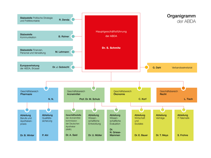 Der Hauptgeschäftsführung sind die Stabsstelle Europavertretung der ABDA, die Stabsstelle Kommunikation, die Stabsstelle Politische Strategie und Politikkontakte, die Stabsstelle Finanzen, Personal und Verwaltung sowie das Verbandssekretariat zugeordnet.