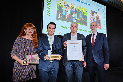 Preisverleihung für den Deutschen Apotheken-Award 2025 am 14. Mai in Berlin: DAV-Vizevorsitzende und Jury-Vorsitzende Anke Rüdinger, Preisträger Dr. Nojan Nejatian, Preisträger Stefan Seibold (beide Heegbach Apotheke, Erzhausen, Hessen), Laudator Berend Groeneveld (v.l.n.r.)