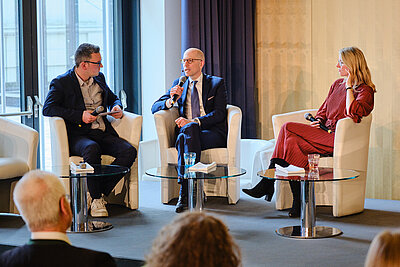 v.l.n.r.: Benjamin Rohrer, Leiter Kommunikation der ABDA, Dr. Jan Hensmann, Referatsleiter für Grundsatzfragen der Gematik, Telematikinfrastruktur und eHealth im Bundesgesundheitsministerium (BMG) und Prof. Dr. Alena Buyx, Professorin für Ethik der Medizin und Gesundheitstechnologien, Technische Universität München