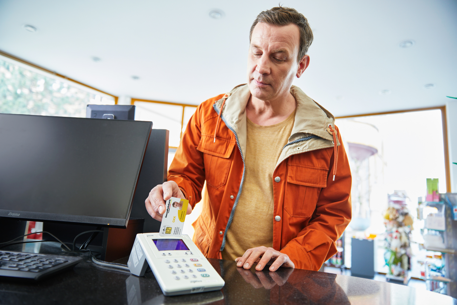 Apotheke, HV-Tisch, eGK, Kartenlesegerät, E-Rezept, ePA, elektronische Patientenakte, Patientenakte, Mann, Patient, Gesundheitskarte, Krankenkassenkarte, Versicherter, Digitalisierung
