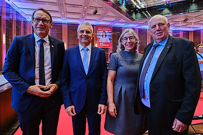 Thomas Preis,Vorsitzender Apothekerverband Nordrhein, DAV-Vorsitzenden Dr. Hans-Peter Hubmann, ABDA-Präsidentin Gabriele Regina Overwiening und Karl-Josef Laumann, Minister für Arbeit, Gesundheit und Soziales des Landes Nordrhein-Westfalen (v.l.)