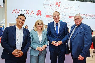 Metin Ergül, Geschäftsführer der Avoxa – Mediengruppe Deutscher Apotheker, Bundesgesundheitsministerin Nina Warken (CDU), ABDA-Präsident Thomas Preis, Karl-Josef Laumann (CDU), Minister für Arbeit, Gesundheit und Soziales von Nordrhein-Westfalen (v.l.)