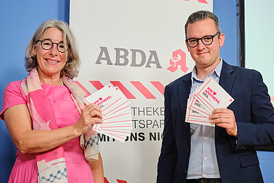 ABDA-Präsidentin Gabriele Regina Overwiening sowie ABDA-Kommunikationschef Benjamin Rohrer
