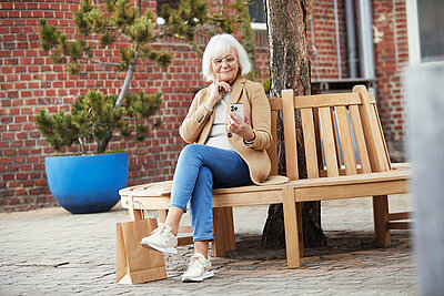 Bank, E-Rezept, Frau, Handy, Polymedikation, Smartphone, pDL