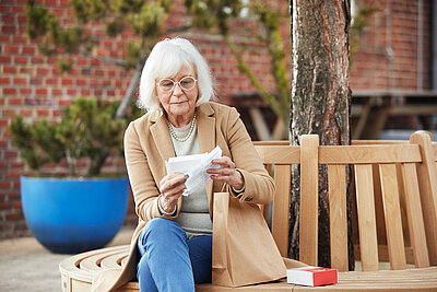 Bank, Beipackzettel, E-Rezept, Frau, Handy, Packungsbeilage, Polymedikation, Smartphone