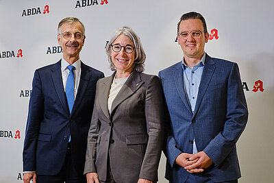 ABDA-Hausptgeschäftsführer Dr. Sebastian Schmitz, ABDA-Präsidentin Gabriele Regina Overwiening, Leiter Kommunikation Benjamin Rohrer (v. l.)