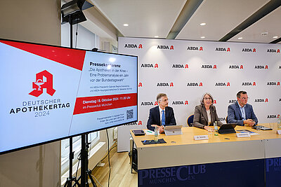 ABDA-Hausptgeschäftsführer Dr. Sebastian Schmitz, ABDA-Präsidentin Gabriele Regina Overwiening, Leiter Kommunikation Benjamin Rohrer (v. l.)