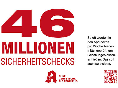 Das Motiv thematisiert die "46 Millionen Sicherheitschecks", die bundesweit in den Apotheken jede Woche durchgeführt werden, um Fälschungen von Arzneimitteln auszuschließen. Gemeint sind damit die 46 Millionen wöchentlichen Transaktionen (Stand: 2023) im Rahmen der Europäischen Fälschungsschutzrichtlinie, die hierzulande unter dem Namen "securPharm" bekannt ist. Bereits mit der PZ-Ausgabe am 8. August 2024 war das Plakat "3 Millionen Antworten" an die Apotheken verteilt worden. So viele Menschen kommen jeden Tag mit Fragen in die Apotheken vor Ort.