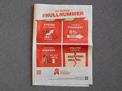 Sofort springt den Leserinnen und Lesern ins Auge, warum die Apotheken wirtschaftlich gestärkt werden müssen. Kurz und knapp wird mit der Anzeige erklärt: Die Kosten explodieren, das Honorar stagniert, die Apotheken sterben und die Politik schaut zu. Darüber ist das Hashtag #Nullnummer zu sehen. Und über einen QR-Code ist die Homepage von www.gesundheitsichern.de erreichbar.