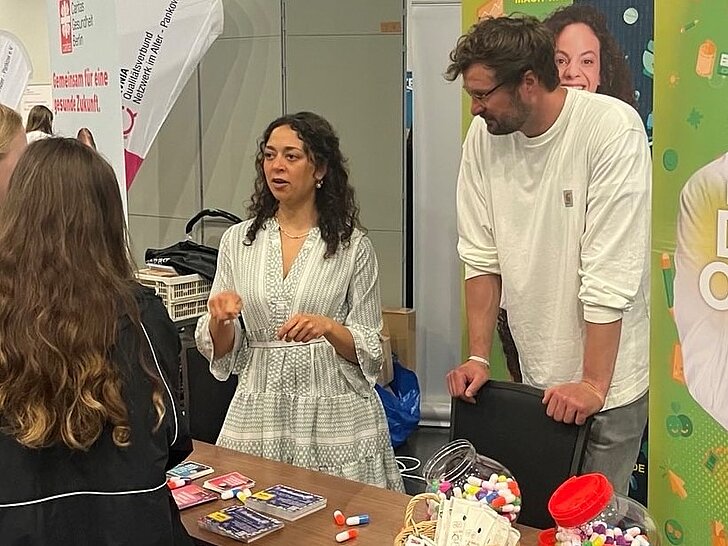 Neben den beiden Lichtenberger Apothekeninhaberinnen wurde der Stand auch von Apothekerin Melia Yazici und PTA Sebastian Michel betreut. Yazici hat ihr Studium der Pharmazie vor nicht allzu langer Zeit abgeschlossen und berichtete begeistert von ihrer Arbeit in der Offizin. So ergaben sich viele lockere Gesprächen mit den Jugendlichen über den Alltag in der Apotheke.