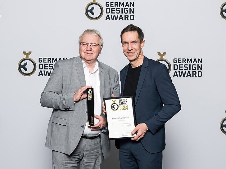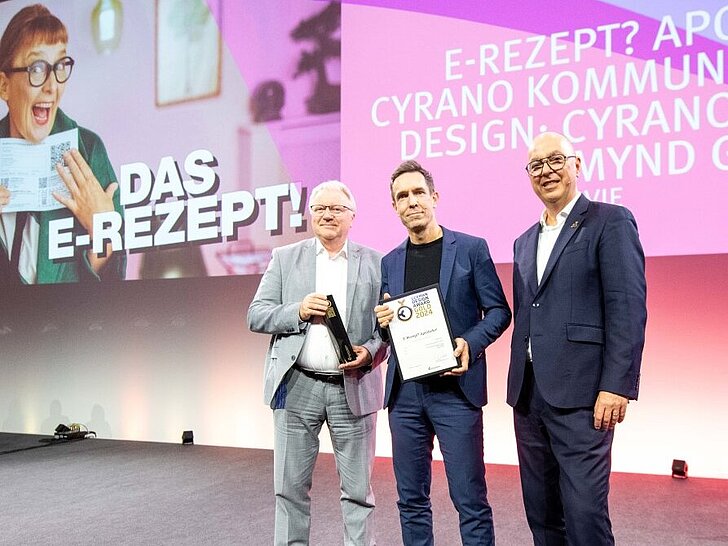 Die E-Rezept-Videos der ABDA haben jetzt auch den "German Design Award" in Gold gewonnen. ABDA-Vizepräsident Mathias Arnold sowie Gerrit Lemkau, Kreativdirektor der Kommunikationsagentur Cyrano, nahmen den Preis in der Wettbewerbskategorie Audiovisual am 26. Januar 2024 in Frankfurt am Main entgegen. Die Jury lobte die Videotrilogie "E-Rezept? Apotheke!" insbesondere für ihre "unterhaltsame und kunstvolle" Gestaltung. Die in den Sozialen Medien ausgespielten Spots verbinden gesundheitsrelevante Informationen mit einer interessanten Optik und tragen so zur Verbreitung und Nutzung des E-Rezepts bei.