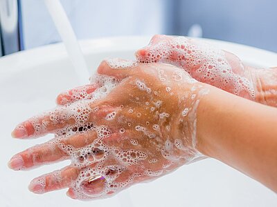 Man sollte sich oft die Hände waschen. Wasser und Seife reichen dafür aus – antimikrobielle Zusätze sind in aller Regel nicht notwendig. Die Temperatur des Wassers spielt keine Rolle. Das Händewaschen sollte mindestens 20 Sekunden dauern. Benkert: „Man muss dafür nicht auf die Uhr sehen. Einfach zweimal das Lied ‚Happy Birthday‘ summen, das entspricht 20 Sekunden.“ Nach dem Waschen die Hände gründlich abtrocknen.