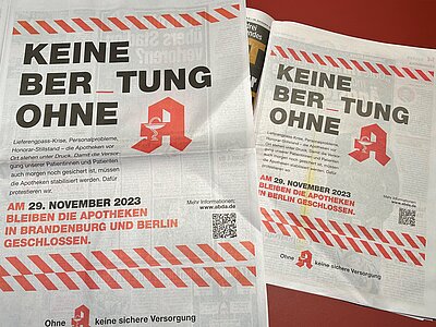 In Berlin, Brandenburg, Sachsen, Sachsen-Anhalt und Thüringen bleiben heute viele Apotheken wegen des vierten Protesttages in diesem Monat geschlossen. Angekündigt wurde der Protesttag am gestrigen Dienstag (28.11.) mit ganzseitigen Anzeigen in den Regionalausgaben der "BILD-Zeitung". In Berlin wurde die Anzeige auch in der "B.Z." geschaltet. Abgedruckt wurde das Protestmotiv, das auf die Lieferengpass-Krise, die Personalprobleme und den Honorar-Stilstand hinweist. Heute ist zum letzten Mal in diesem Monat eine zentrale Kundgebung der Apothekenteams geplant. Die Apothekerinnen, Apotheker, PTA und PKA der o.g. Bundesländer treffen sich um 14 Uhr auf dem Theaterplatz in Dresden zu einer Kundgebung. In den vergangenen Wochen hatte es Kundgebungen mit mehreren tausend Teilnehmern jeweils mittwochs in Hannover, Dortmund und Stuttgart gegeben.
