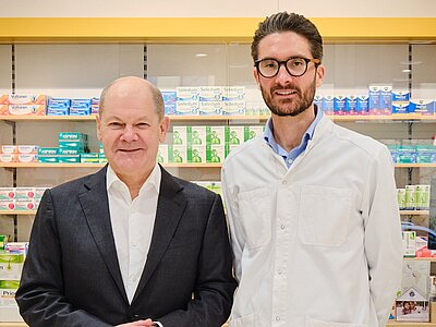 Bundeskanzler besucht Apotheke in Teltow (Brandenburg)