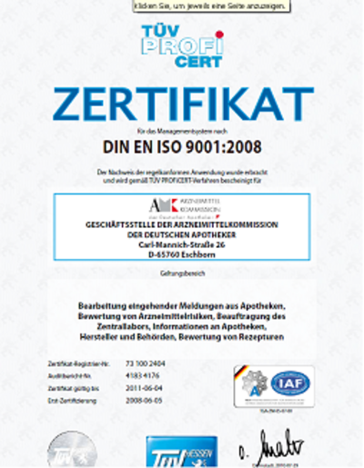 Die Geschäftsstelle der Arzneimittelkommission der Deutschen Apotheker (Eschborn) ist im Juni 2008 durch den TÜV Hessen erstmalig zertifiziert worden. Im Juni 2010 hat sie ihr Qualitätsmanagement auf die neue DIN EN ISO 9001:2008 Norm umgestellt und darüber hinaus das Qualitätsmanagement-Handbuch vollständig überarbeitet und aktualisiert.
